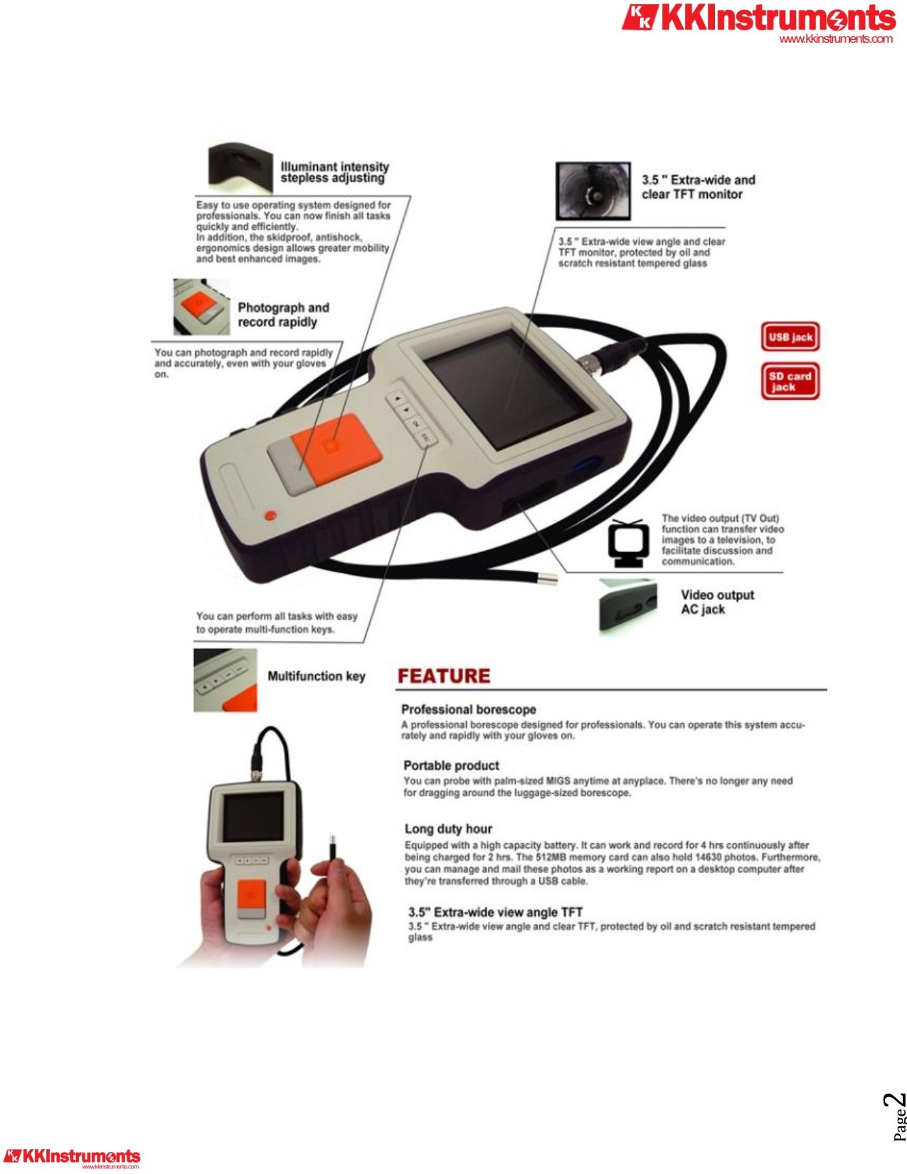 With optional accessories of 3.9 mm, 5.5mm, 8mm, 10mm, 25mm, .... diameter camera probe, it can be used to check petroleum & diesel engines, cylinder, transmission system, breaking system, suspension systems, air conditioning systems, piping/plumbing system inspection.