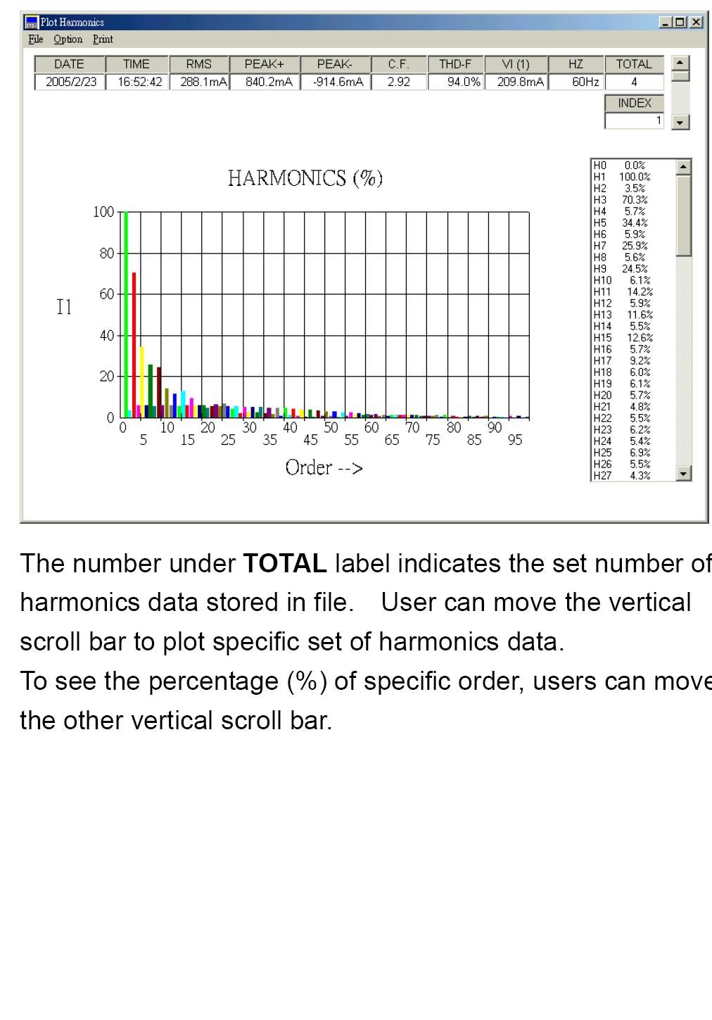 Harmonics of AC Voltage in % and in Magnitude (1 to 99th order, minimum voltage at the 50 or 60 Hz>AC 80V)