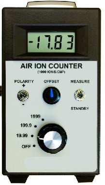 The Air Ion Counter is a handheld meter designed to measure ion density-- the number of ions per cubic centimeter (ions/cc) in air. It measures this number separately for positive and negative ions (+ and - ions are usually present simultaneously). This instrument is a true ion density meter, based on a Gerdien Tube (Gerdien Condenser) design, and it contains a fan which pulls air through the meter at a calibrated rate. The standard model measures up to 2 million ions/cc (for comparison, outdoor air typically has 100 to 1000 ions/cc, both + and -). The 2 million range is sufficient for almost all situations except for measuring very close to electric ionizers or strong radioactive sources. For these applications, models with ranges of 20 million and 200 million ions/cc are also available. (Range can be specified on the checkout page; all three ranges are USD$1500.)