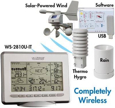 The weather center’s remote sensors can send data wirelessly from a distance up to 200 feet to console. For data storage on a home computer, the weather center comes with a USB transceiver and the free download of La Crosse’s Heavy Weather 2800 Pro PC software v.1.3 (compatible with Windows XP, Vista, and Windows 7 operating systems). The transceiver communicates with the receiver from up to 80 feet away.LAC0003 WEATHER STATION SOLAR RAIN, WIN.